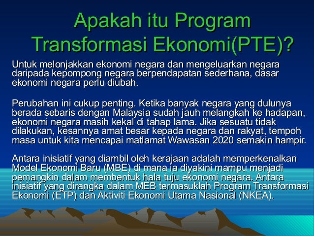 Program transformasi nasional ntp terus membina daya tahan ekonomi malaysia melalui usaha mempelbagaikan ekonomi yang diterajui 12 bidang ekonomi utama negara nkea demikian menurut laporan tahunan ntp 2017. Bidang ekonomi utama negara oleh kerana 92 daripada jumlah pelaburan akan berasal dari sektor swasta sektor ini banyak terlibat dalam perancangan pelan perubahan ini. Satu bengkel telah dianjurkan oleh unit pengurusan prestasi dan pengurusan pemandu untuk mengenal pasti 12 bidang ekonomi utama negara nkea. Etp memberi fokus kepada 12 bidang ekonomi utara negara nkea iaitu.