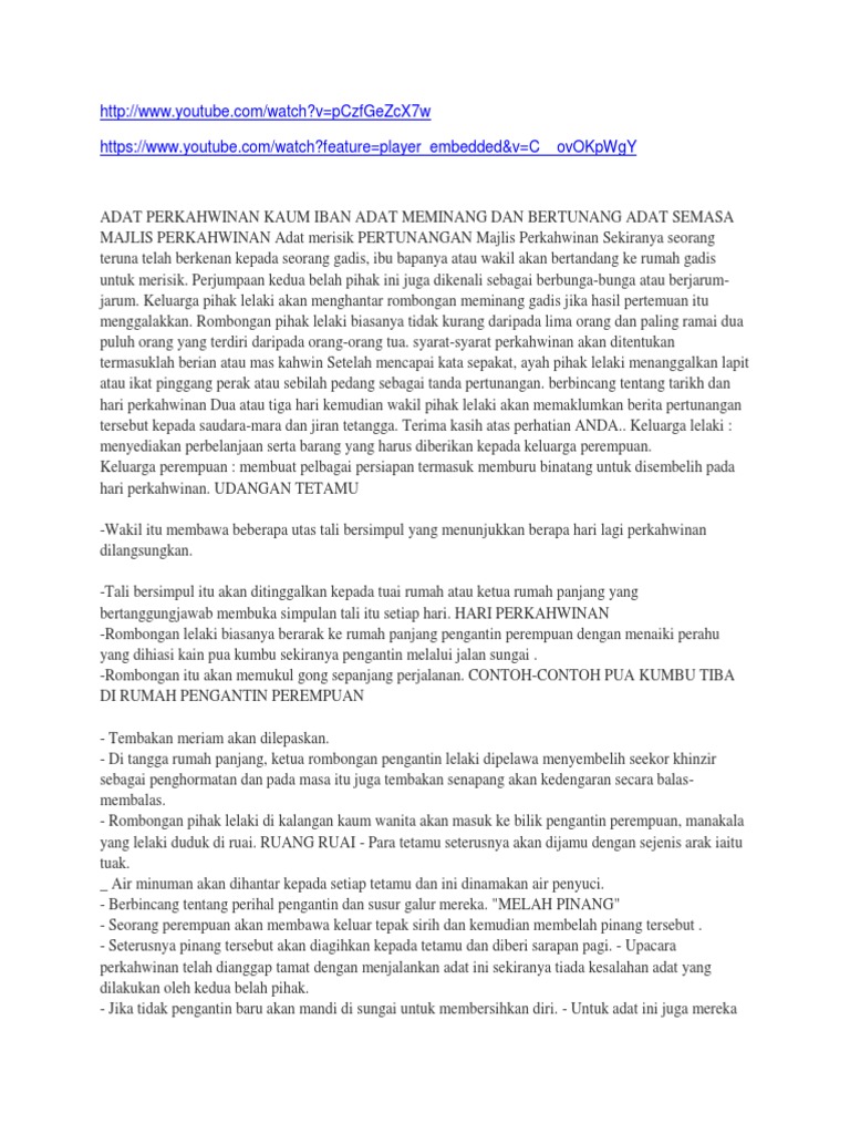 Muhammad harith bin mokhtar 30dls14f2021 ahmad syahir hazzil 30dls14f2037 baskaren a l padmanathan 30dls14f2040. Masyarakat iban di sarawak kaya dengan adat serta warisan budaya yang dipegang dan diamalkan dalam kehidupan seharian apa yang menjadikan masyarakat iban unik adalah dari segi adat perkahwinannya kerana wujudnya beberapa peraturan yang. Bagi mana mana pihak yang melanggar adat mereka akan dikenakan denda yang bertujuan untuk mengelak pasangan suami isteri tersebu t ditimpa bala atau kesus a han terdapat beberapa peringkat tertentu dalam adat perkahwinan kaum iban. A merisik dalam masyarakat iban perkahwinan biasanya ditentukan oleh pengantin lelaki.