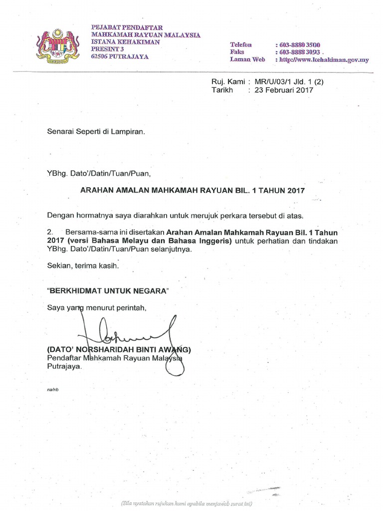 The Registrar Of The Court Of Appeal Has Extended To Us Revised Versions Of Arahan Amalan Mahkamah Rayuan Bil 1 Tahun 2017 In Bahasa Melayu And English Which Are Attached