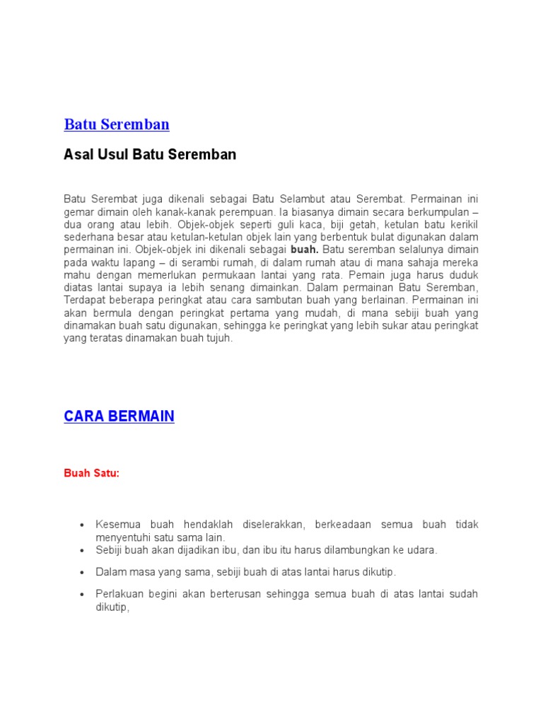 Asal usul batu seremban. Asal usul batu seremban dikenali juga sebagai selambut atau serembat. Objek objek seperti guli kaca biji getah ketulan batu kerikil sederhana besar atau ketulanketulan objek lain yang berbentuk bulat digunakan. Kebiasaannya pemain menggunakan guli kaca biji getah ketulan batu kerikil atau objek lain berbentuk bulat. Sejarah dan asal usul batu seremban batu seremban juga dikenali sebagai batu selambut atau serembat.