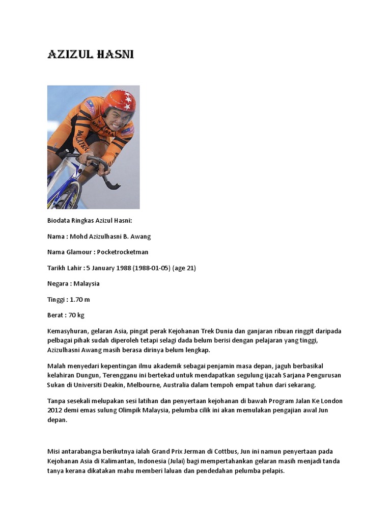 From the section olympics. Azizulhasni awang satu nama yang tidak asing lagi di arena sukan tanah air terutamanya bagi sukan berbasikal. Biodata azizulhasni awang pelumba basikal handalan malaysia nama malaysia terus mengharum di mata dunia apabila pelumba basikal negara azizulhasni awang menjuarai acara keirin di kejohanan trek dunia 2017 di hong kong china pada 13 april 2017 lalu. Last updated on 8 june 2012 8 june 2012.