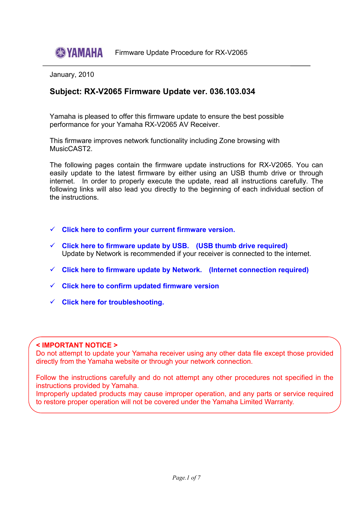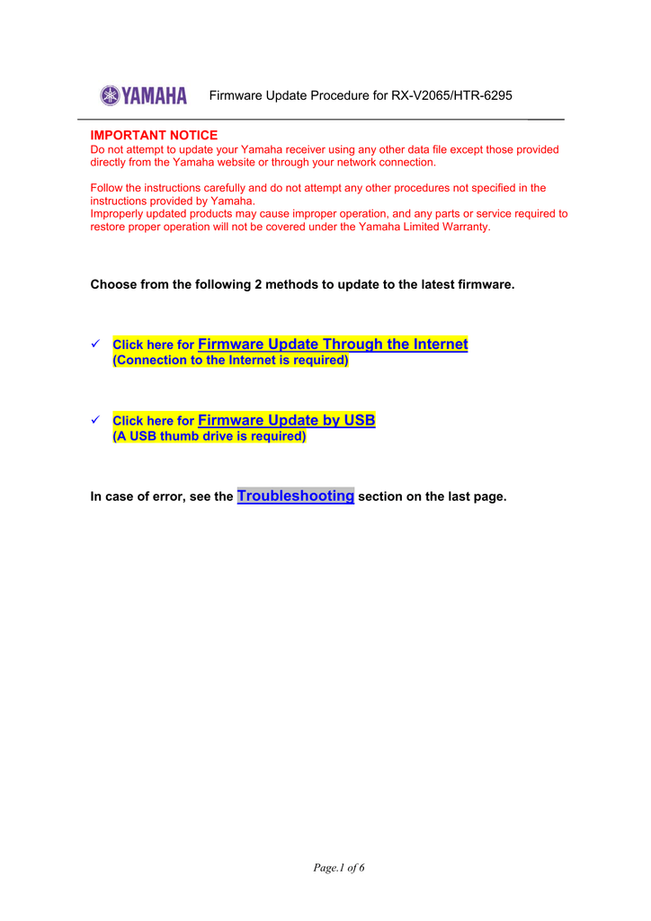 Yamaha Rx V2065 Firmware Update Version 036 103 034 Released January 2010 Usa Model Manualzz